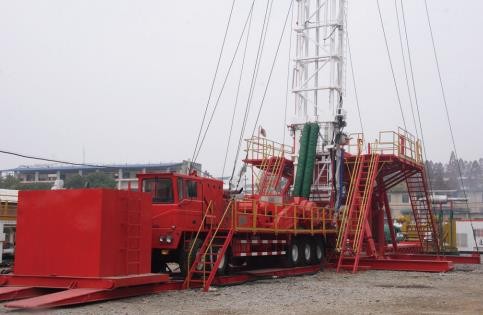 ◆ 柴油機分動箱、絞車和井架放置在自走式底盤車上,用雙節(jié)伸縮式井架,用液缸起升,井架繃繩用地錨固定,配底座或者小修平臺,能夠?qū)崿F(xiàn)修井機快速移運。